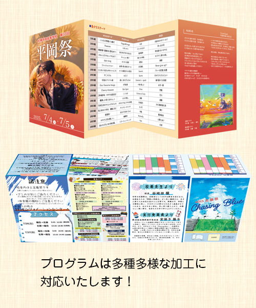 「他の行事で予算がかかる」などの理由で、前年度より予算が減られた場合でもご相談ください。校正のやり取りをメールやご郵送での対応など、ご訪問回数を少なくすることでコストを削減し、ご希望のご予算に合わせられる場合がございます。お気軽にご相談ください。 うちわ、ポスター、プログラムとも札幌市外の学校様の実績がございますが、郵送時間など期間を要することになりますので、ゆとりを持ってご注文ください。 他にも光沢を抑えたマットコート紙も、落ち着いた仕上がりになり好評です。 同じ8ページでも「中綴じ8ページ」よりも「観音折り(8ページ)」の方が値段が高くなります。お見積りご依頼時にはご注意ください。 |